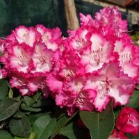 De Rhododendron XXL bloeit in mei met wit/roze bloemen. Uit de rode knop openen zich extra grote witte bloemen welke een felroze tot rood gerafelde rand hebben. De opvallende XXL bloemen bloeien gemiddeld een week langer als de bloemen van de andere soorten. Deze Rhododendron heeft een compact recht opgaande groeiwijze en puntig donkergroen blad. De Rhododendron XXL is goed winterhard en kan prima toegepast worden in een Rhododendronwolk of Rhododendron Border Boeket.
